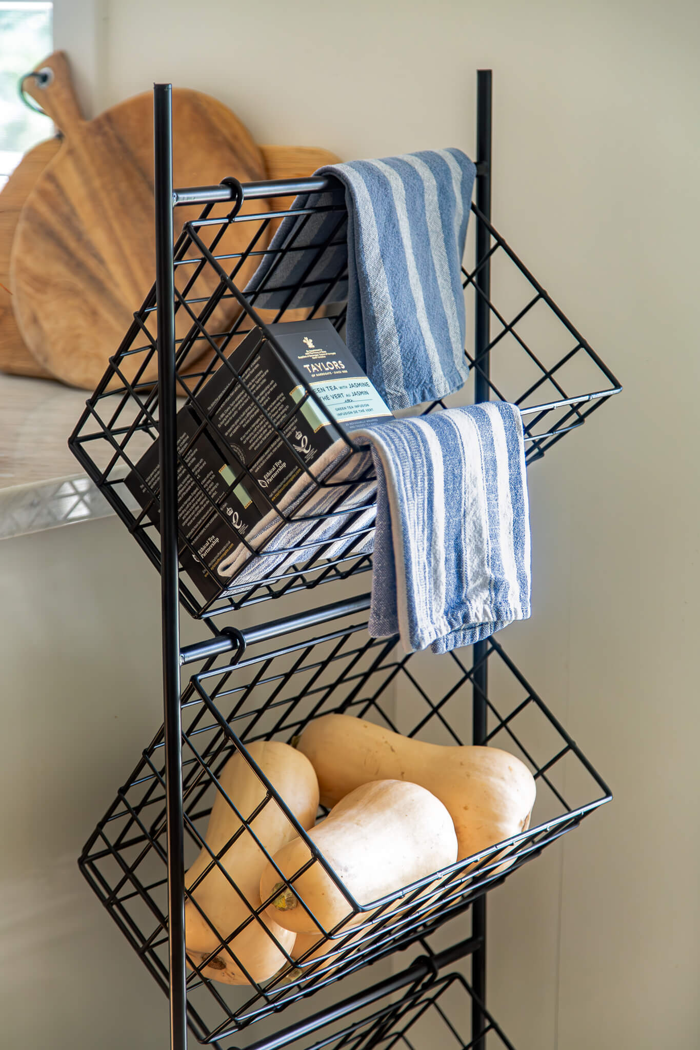 Cette étagère verticale en métal noir est dotée de trois paniers inclinés, parfaits pour organiser et mettre en valeur vos essentiels du quotidien.