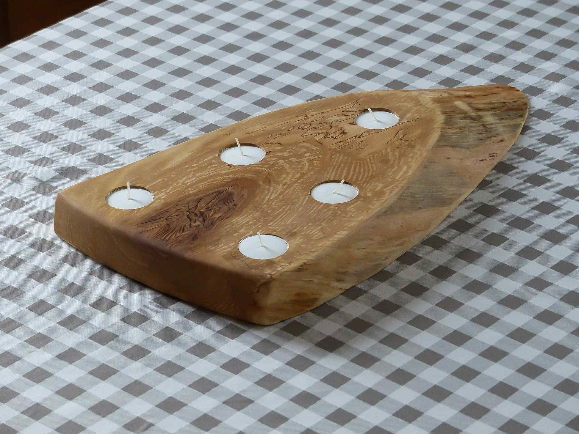 Cette planche porte bougies unique est façonnée à partir de bouleau chauffé (spalted birch), un bois dont les motifs naturels et les variations de teinte créent une texture riche et vivante.
