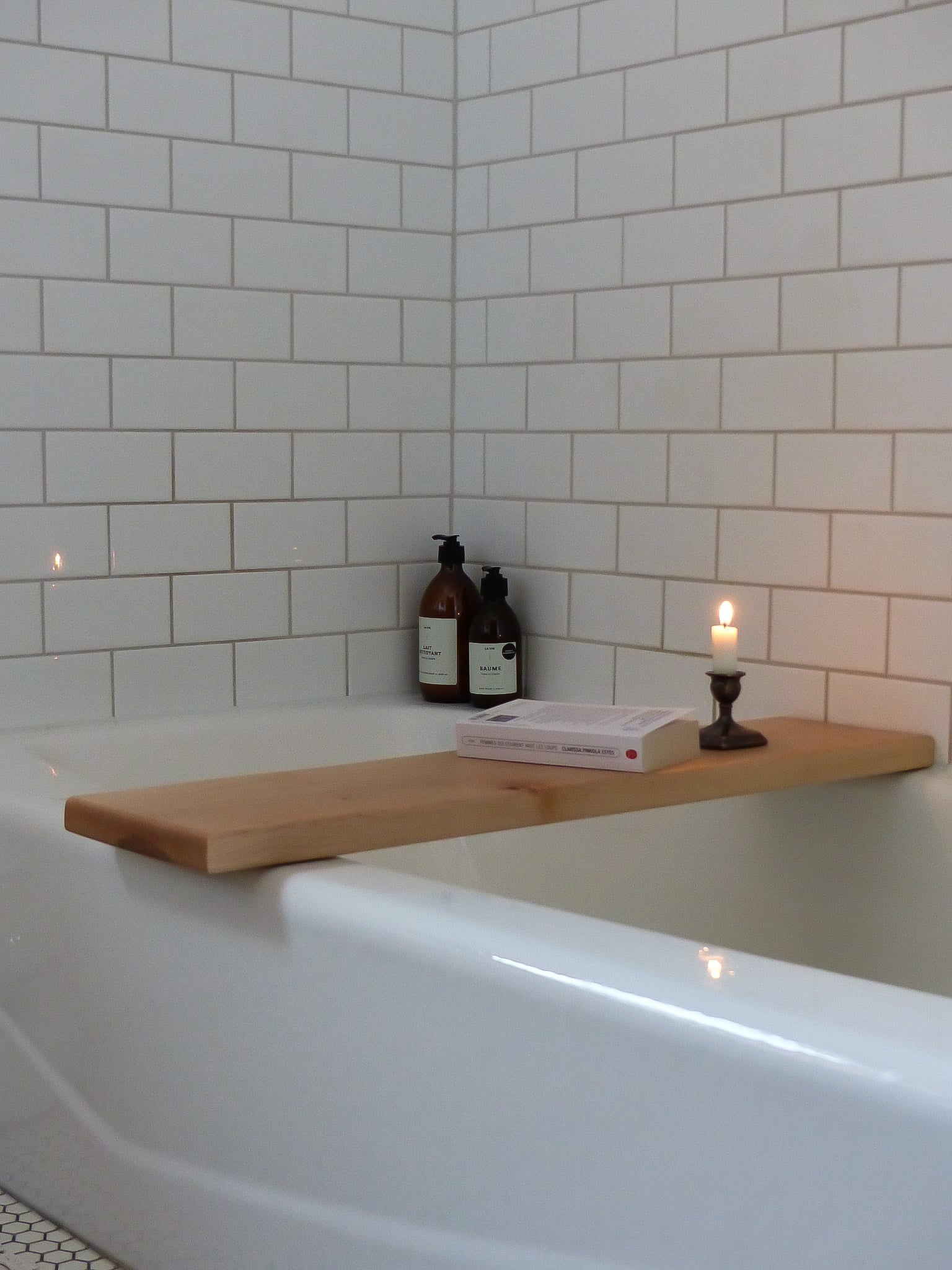 Fabriquée à la main, cette planche de bain en bois d'érable met en valeur la beauté brute et authentique du bois.